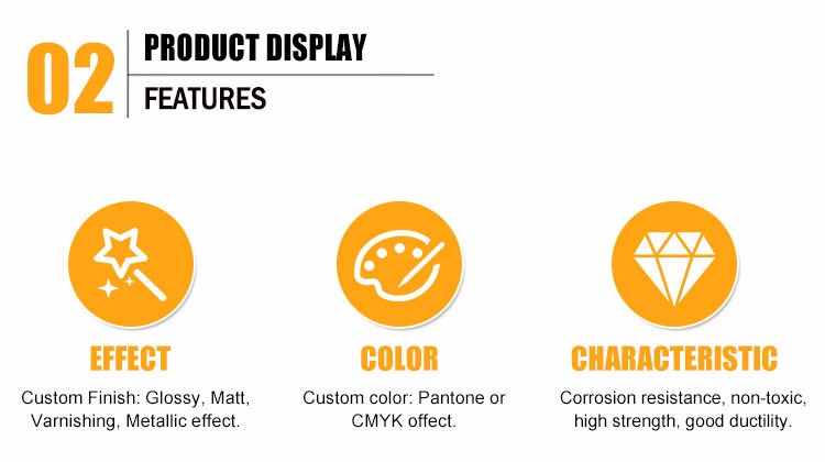 Offset printing (CMYK or PMS); Glossy or matt finish outside; Natural tin silver or gold varnish inside; Metallic effect available; |